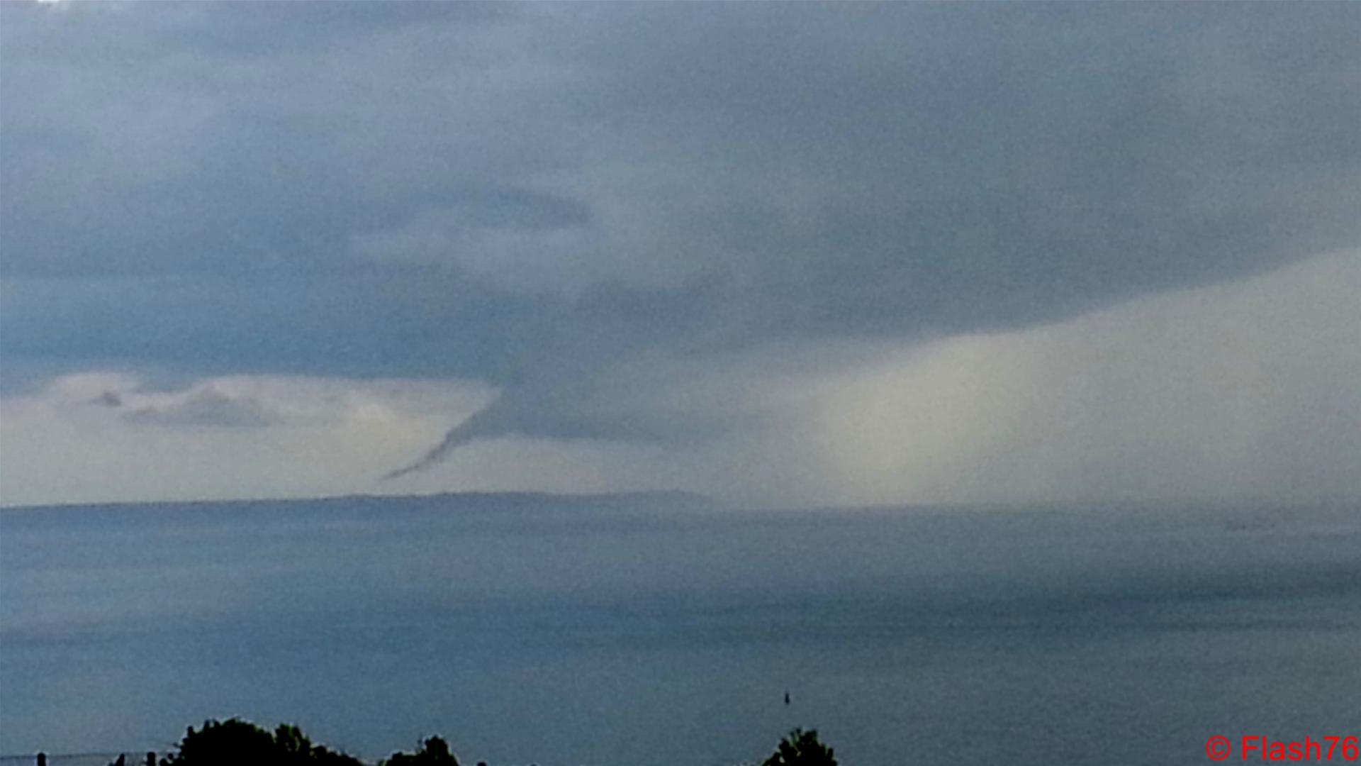 A cette distance, difficile d'appercevoir un quelconque "buisson" ou rotation qui serait dû à l'influence de vents tourbillonnants jusqu'au sol (formant ainsi dans ce cas une tornade, une trombe marine ou un tuba bien développé).