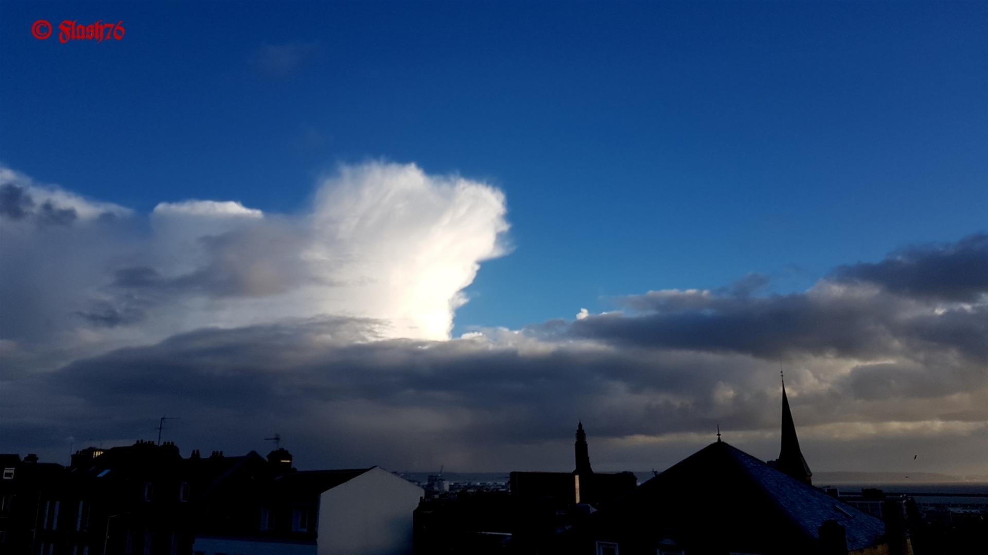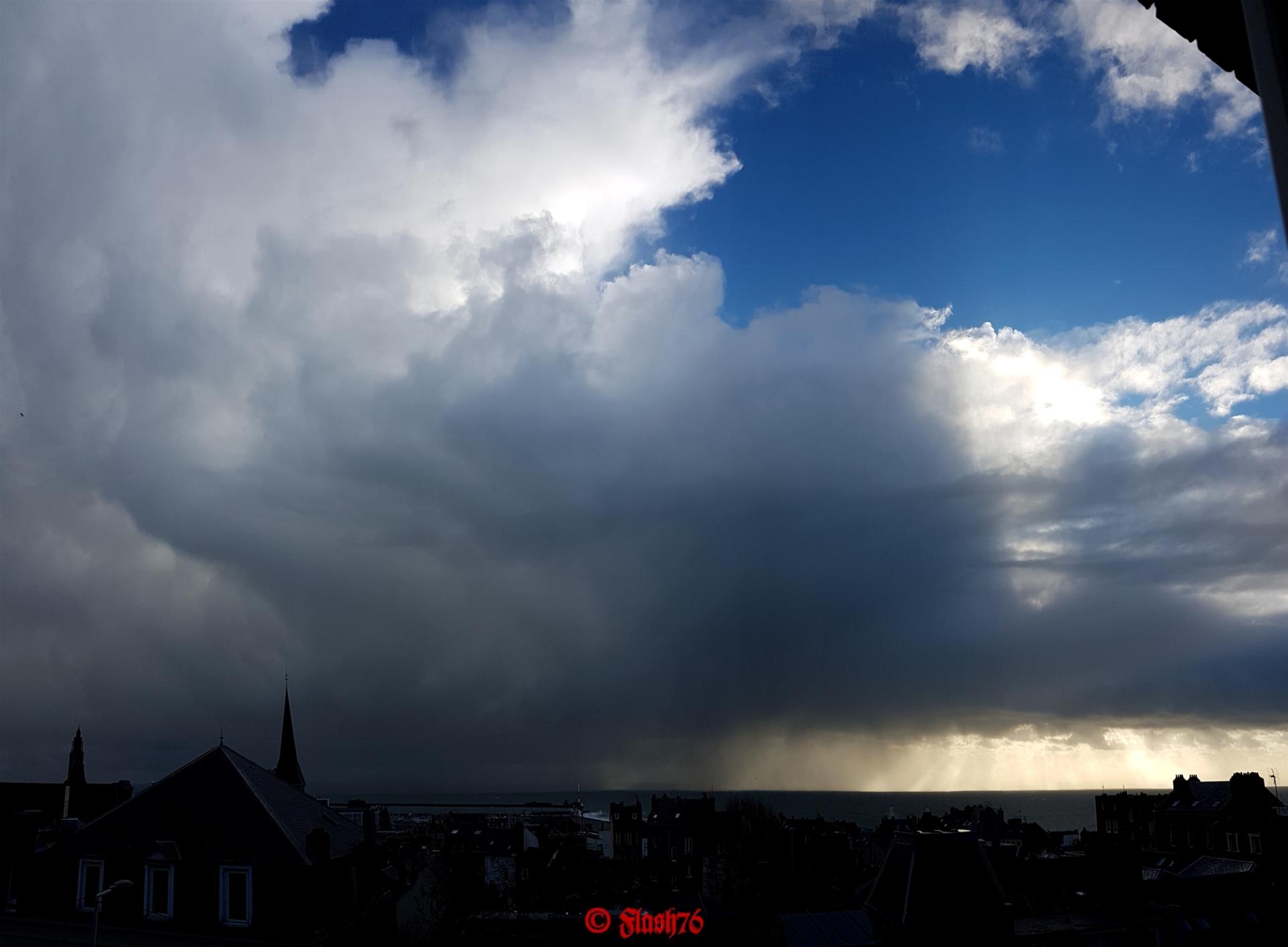 Ciel de traîne, tempête et orages ce 10/02/2019 au Havre avec de belles structures nuageuses (cumulonimbus, cumulus, bourgeonnements d'air froid) et des vagues géantes sur l'entrée du porte du Havre.